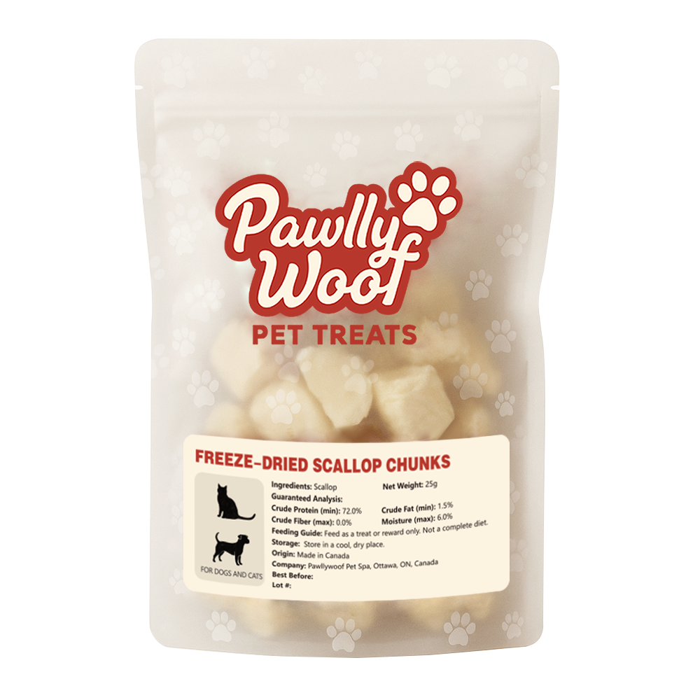 Tender Canadian scallops, freeze-dried to capture pure ocean flavour and high-quality protein. A light, gourmet seafood treat rich in taurine and naturally irresistible to both dogs and cats.